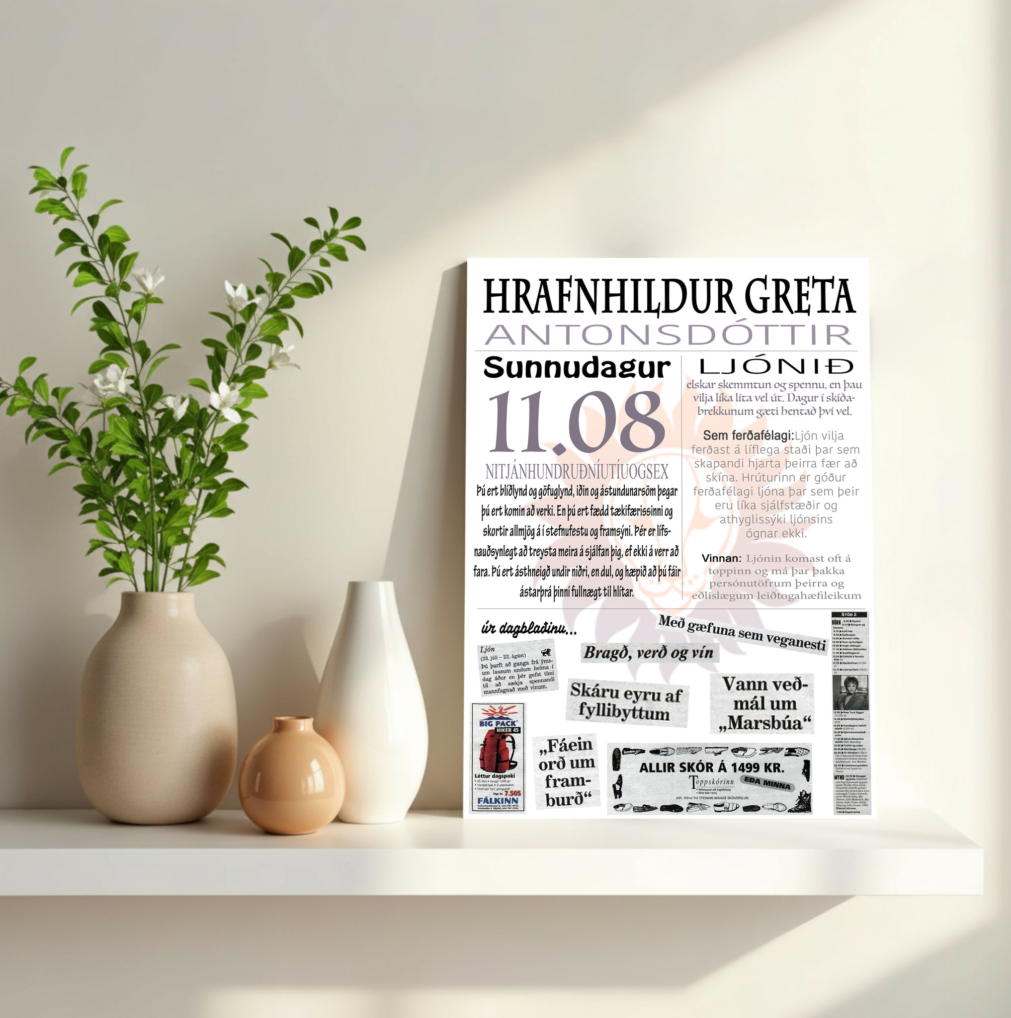 Um stjörnumerkið, afmælisdaginn og að auki blaða úrklippur frá fæðingardegi.
